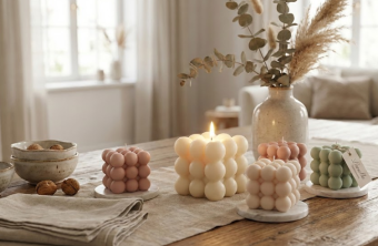 Minimalist / İskandinav: Beyaz, krem tonlarında sade bubble mumlar, silindir formlar.
